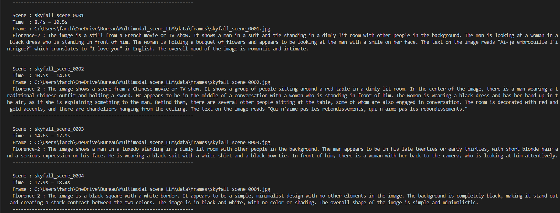 Once scenes were extracted, the system generated visual descriptions using Florence-2, an open-source vision model capable of producing rich scene-level captions. These textual representations were then embedded and stored in ChromaDB to support semantic search.