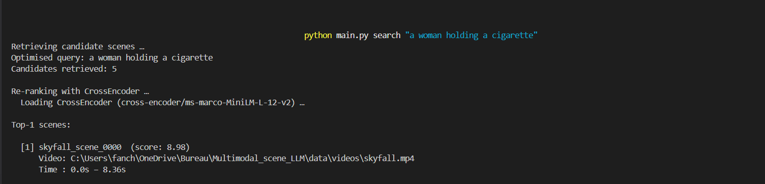 By indexing scenes instead of full videos and combining semantic retrieval with re-ranking, the project provides a more efficient way to surface relevant moments from large media collections.